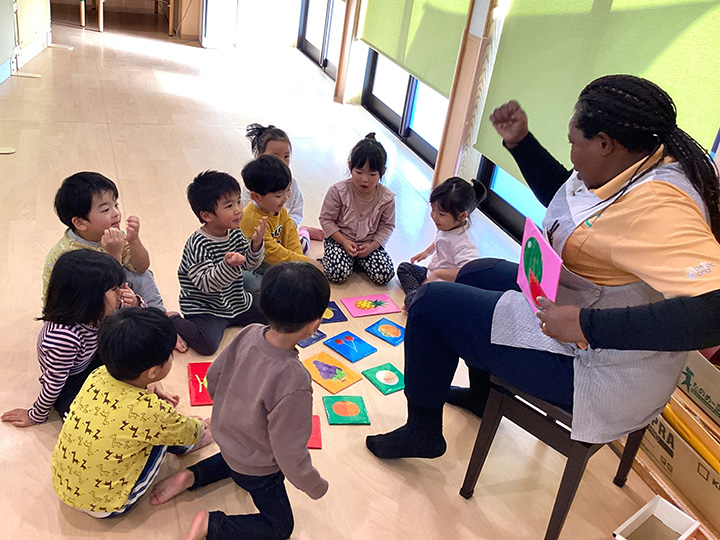 3歳児さんはカードをひいて、それを英語で答えています。今回はみんなが大好きな果物バージョンです。