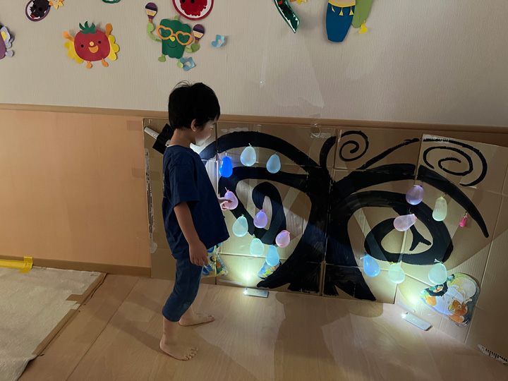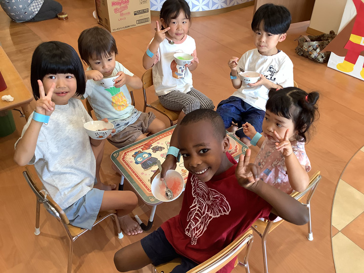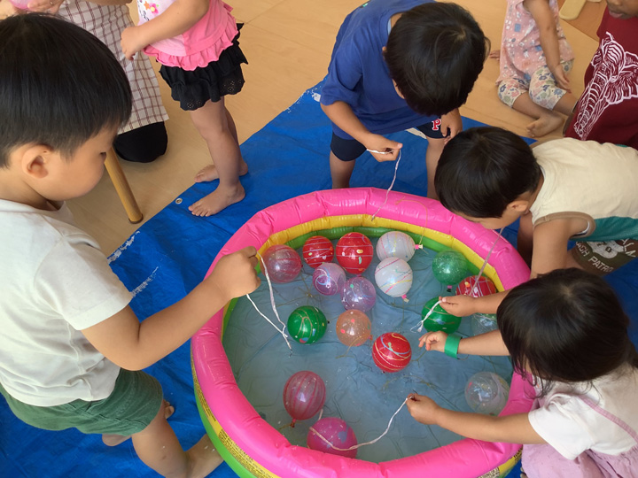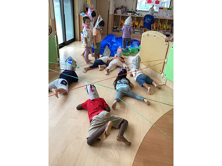夏祭りを楽しむプランが満載。モグラたたきゲームやヨーヨー釣り、輪投げ等みんなで盛り上がりました。 ちょっぴり怖かったおばけやしき。 忍者道場もくもの巣をくぐったり、手裏剣を飛ばしたり 忍者になって忍び足で歩いたりわくわくがいっぱいの夏でした。